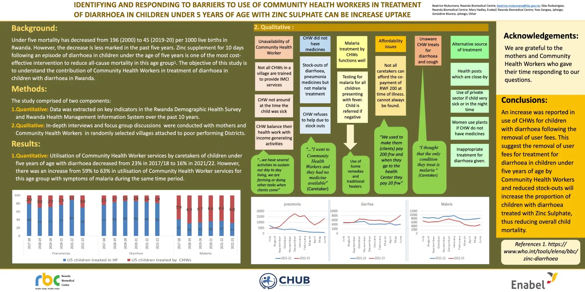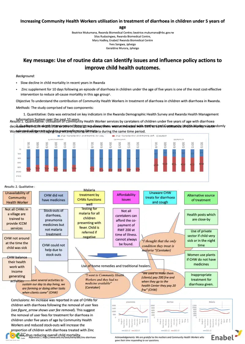 Under-five mortality has decreased from 196 (2000) to 45 (2019-20) per 1000 live births in Rwanda, however, the decrease is less marked in the past five years. Zinc supplement for 10 days following an episode of diarrhoea in under five children is the most cost-effective intervention to reduce all-cause mortality in this age group. In Rwanda all policies and systems are set up to allow every child with diarrhoea to receive Zinc sulphate. We tried to understand whether these policies and systems were fully functioning by analysing routine and survey data and talking to caretakers of children under five years old and the Community Health Workers.